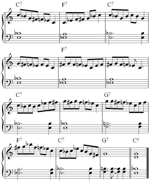 Here's an example of an "improvisation" using "snippets", or patterns from a blues scale. This is the key of C.