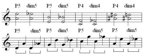 The examples above are either 4ths or 5ths. In each case the top note was lowered a half-step without changing the letter name of the top note; i.e. D to Ab, NOT D to G# for a diminished 5th.