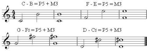 Below are the same intervals EXCEPT they have been changed from major sevenths to minor sevenths. They each consist of a P5 + m3: